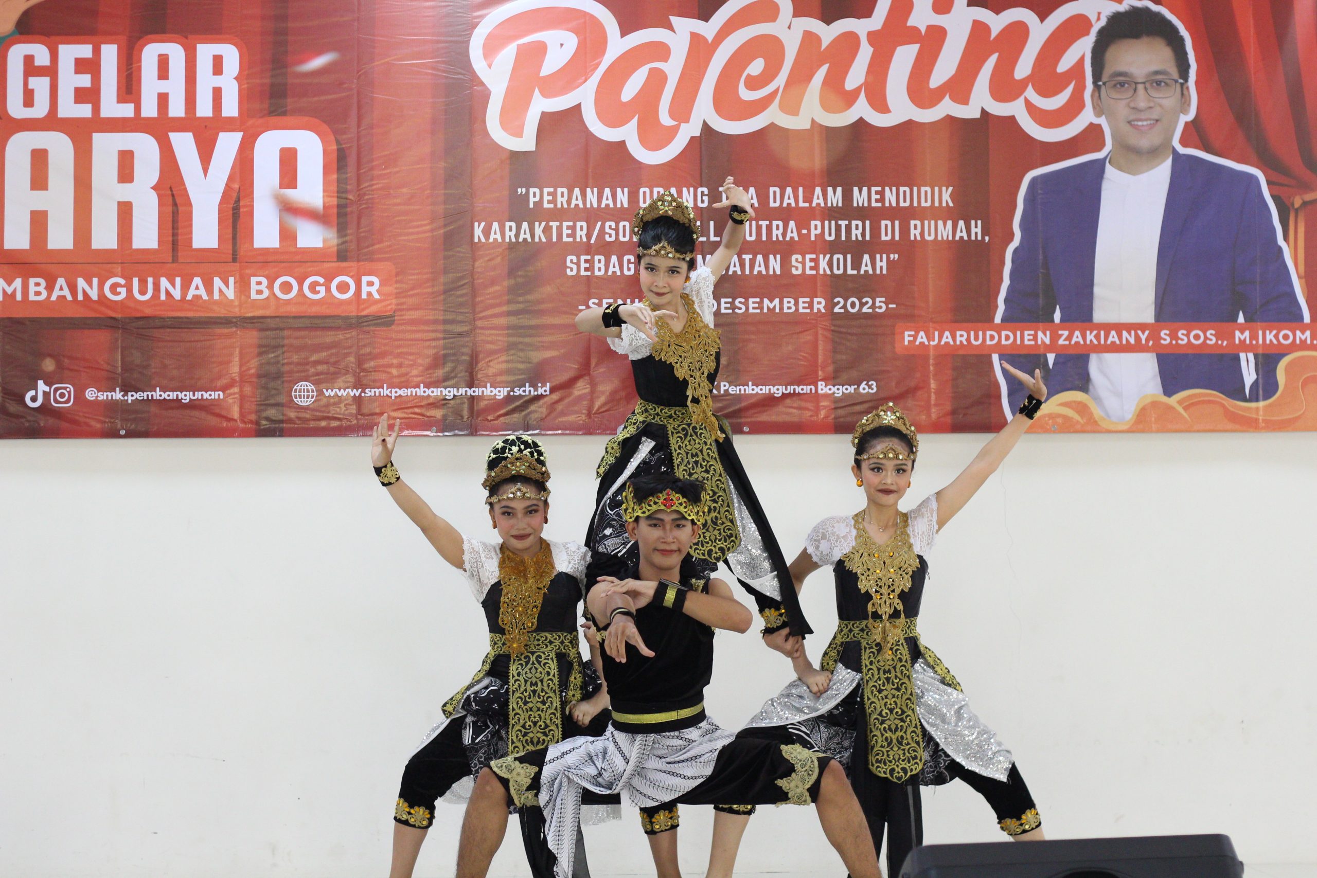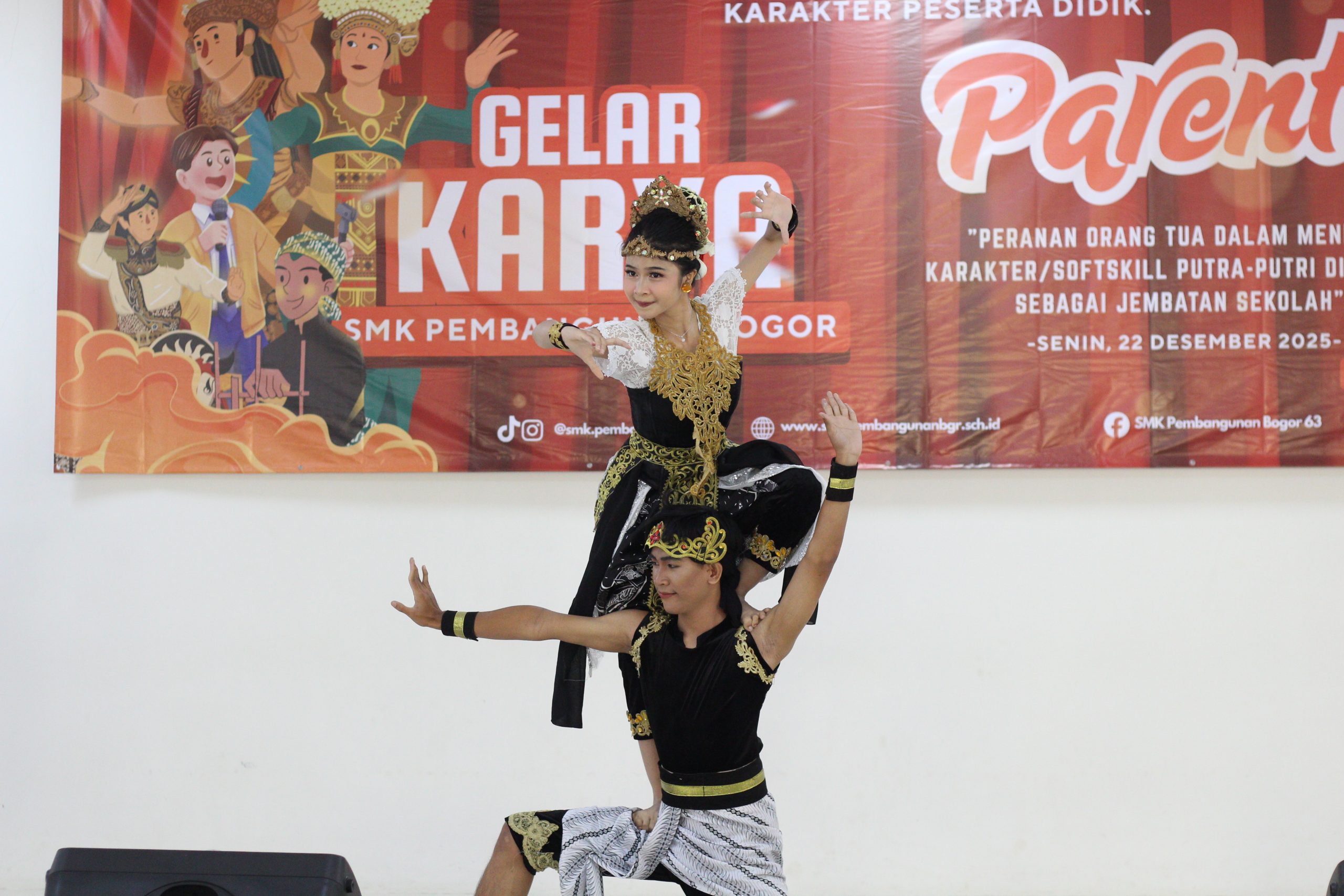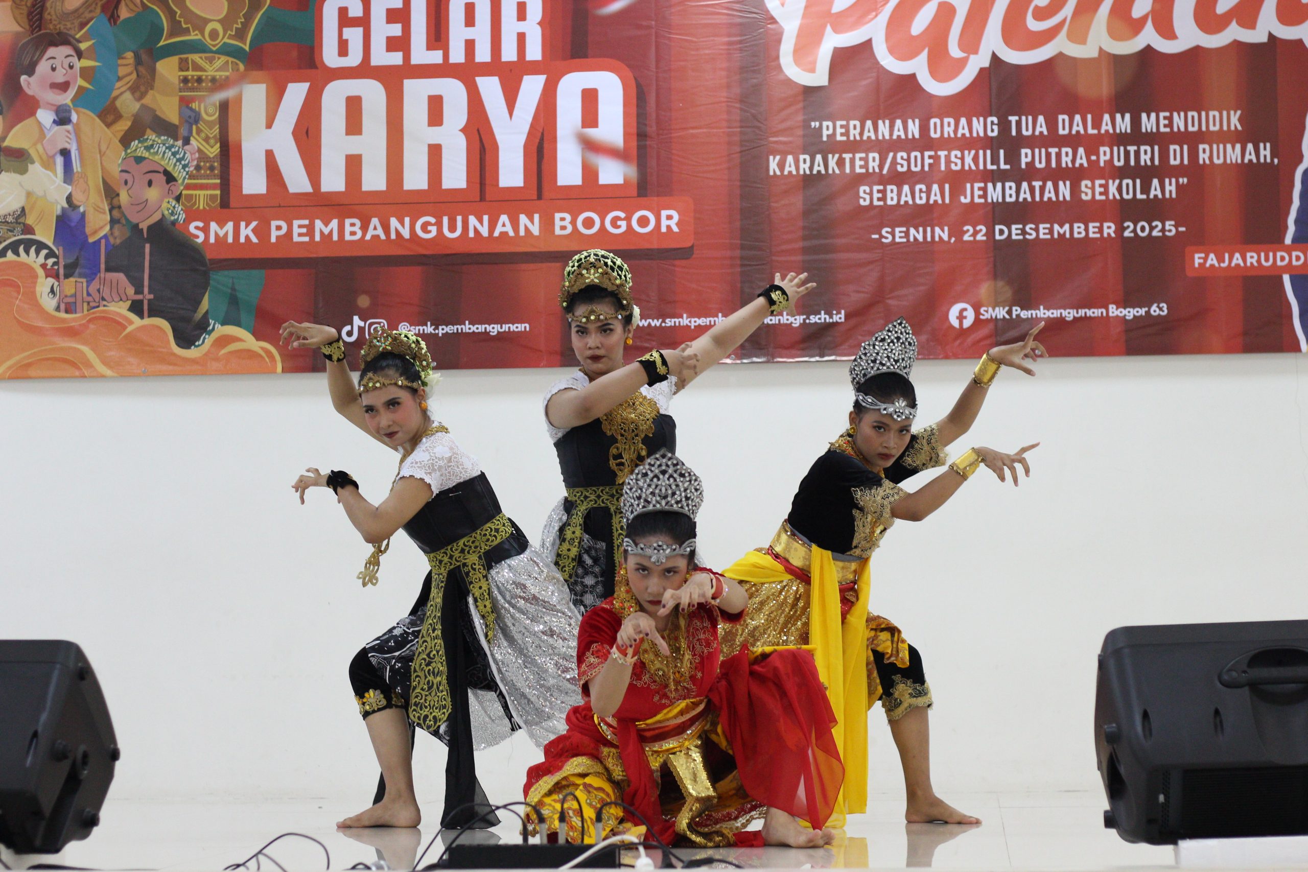 Selain itu, acara juga dimeriahkan oleh penampilan tari tradisional kedua, yaitu Tari Gandrung Bandung. Tarian ini melambangkan rasa syukur, kegembiraan, serta semangat kebersamaan masyarakat Sunda. Dengan gerakan yang dinamis dan ekspresif, Gandrung Bandung mencerminkan keramahan, keceriaan, dan kecintaan terhadap budaya daerah. Penampilan ini menjadi bukti bahwa siswa SMK Pembangunan Bogor mampu melestarikan budaya lokal sekaligus menampilkannya secara kreatif dan menarik.